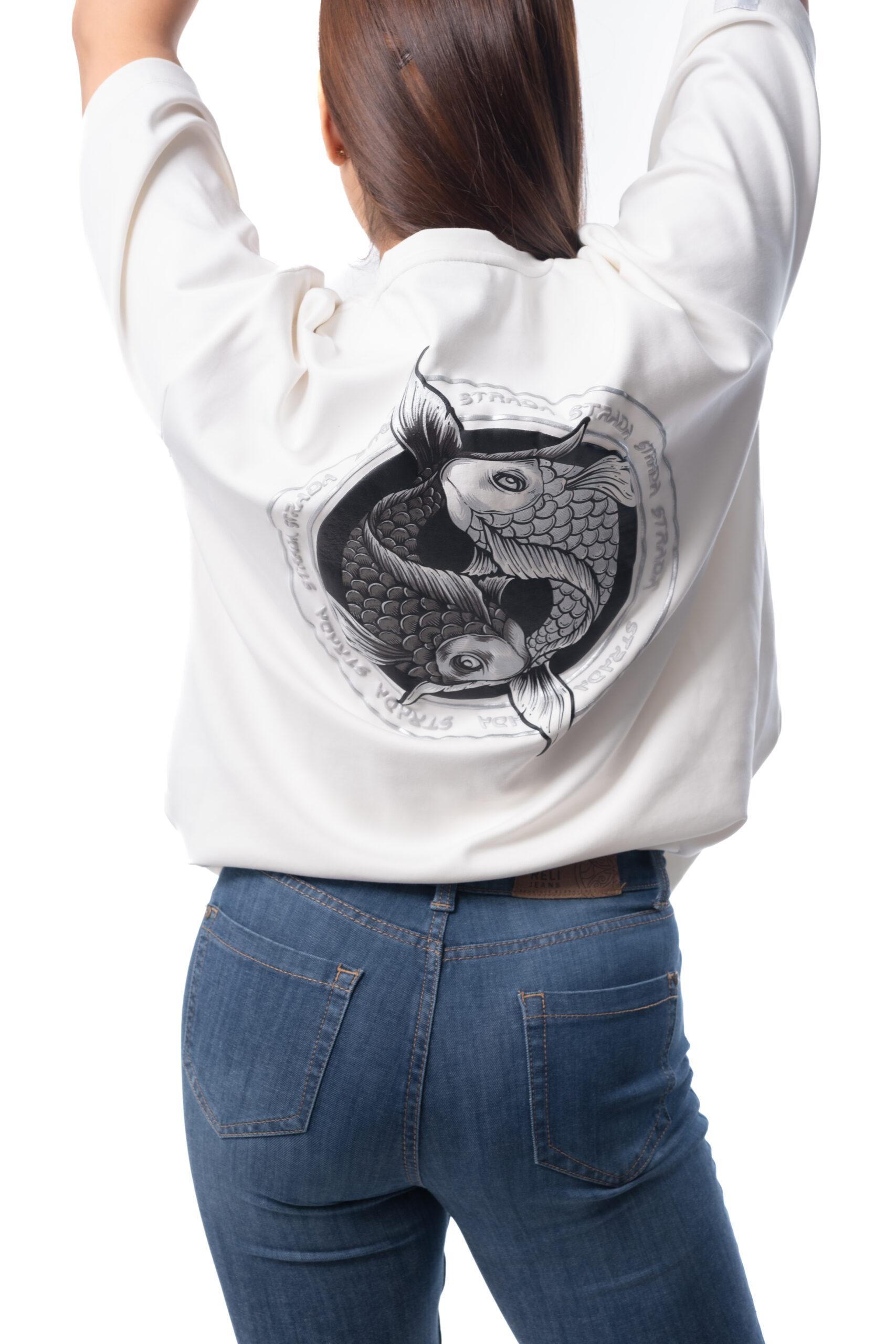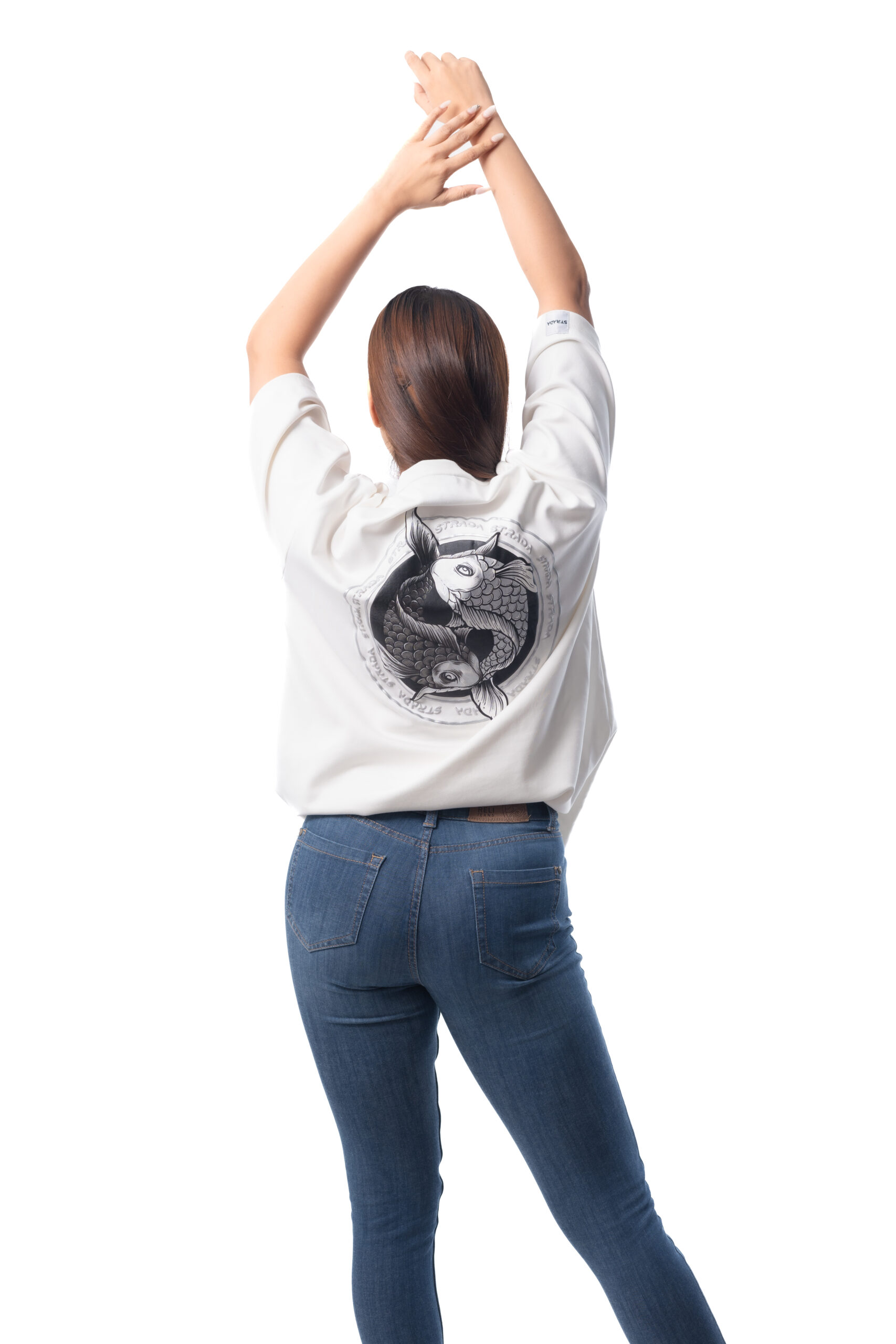 The Strada White Oversized T-Shirt is the perfect blend of comfort and style. Made from premium-quality fabric, this relaxed-fit tee features a unique two-fish print on the back, symbolizing balance and harmony. Its minimalist front and eye-catching back design make it a standout piece for casual outings or everyday wear.
